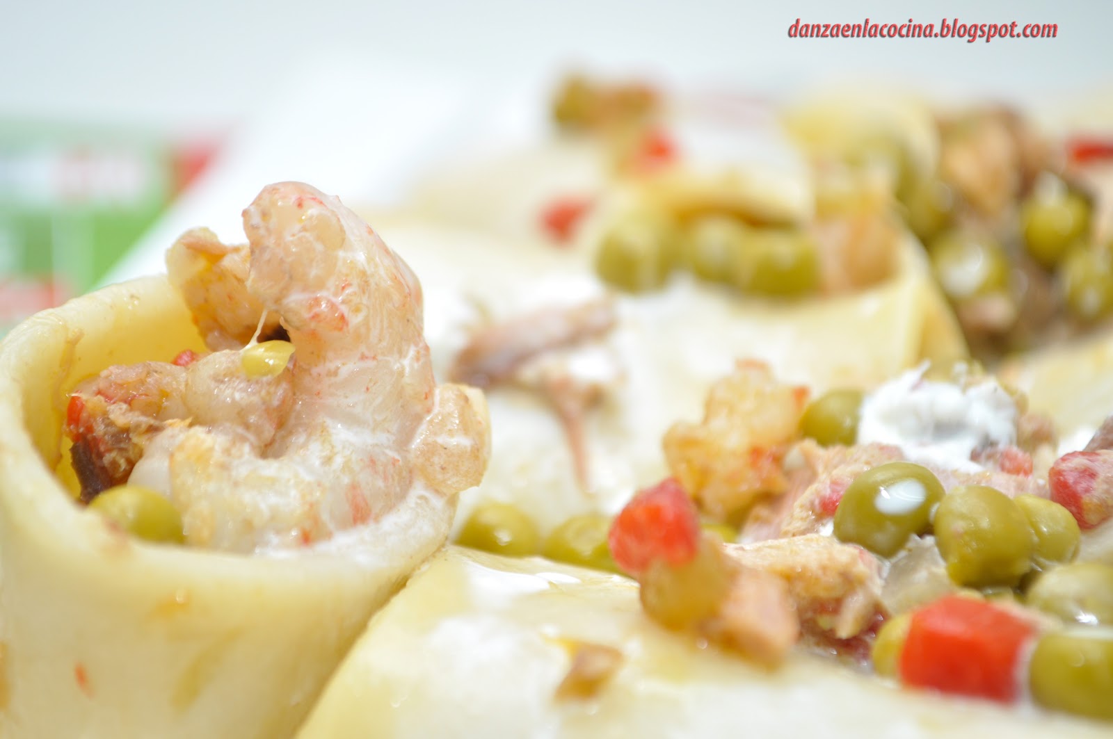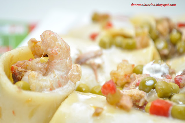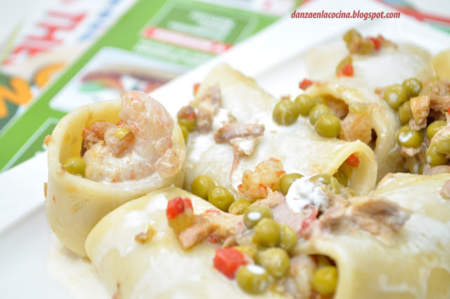 Mezclar el resto de ingredientes si es que los empleamos enlatados como ha sido este caso y rellenar la pasta.